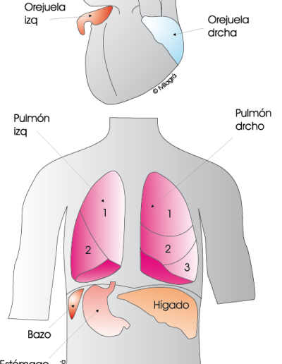 En la figura superior izquierda se muestra una ordenación de situs solitus con el hígado a la derecha, el estómago a la izquierda, el pulmón derecho con tres lóbulos y la orejuela derecha a la derecha. En ocasiones la situación normal está totalmente invertida, de tal forma que los órganos normalmente derechos están a la izquierda y viceversa. Esta situación se conoce como Situs Inversus, tal como muestra la figura superior derecha, y afecta aproximadamente a 1/8.500 de los recién nacidos vivos. Es de reseñar, que esta anomalía se asocia con cardiopatía congénita solo en un 0,6-0,8%. Aunque esta asociación no es, pues, frecuente, hay que tenerla en cuenta ante el diagnóstico de situs inversus.